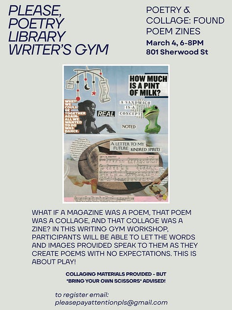 Wednesday, March 4th 6-8 PM, Writer’s Gym (a free monthly writing workshop with rotating facilitators and themes)—Poetry & collage: found poem zines. What if a magazine was a poem, that poem was a collage, and that collage was a zine? In this writing gym workshop, participants will be able to let the words and images provided speak to them as they create poems with no expectations. This is about play! Collaging materials provided - but *bring your own scissors* advised!