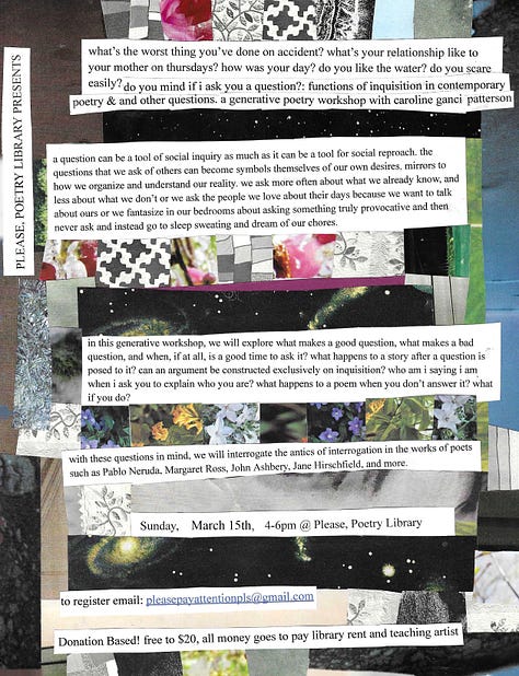 Sunday, March 15th, 4-6pm, functions of inquisition in poetry & other questions, a poetry workshop with Caroline Ganci Patterson, what’s the worst thing you’ve done on accident? what’s your relationship like to your mother on thursdays? how was your day? do you like the water? do you scare easily? do you ski? in this generative workshop, we will explore what makes a good question, what makes a bad question, and when, if at all, is a good time to ask it? what happens to a story after a question is posed to it? can an argument be constructed exclusively on inquisition? who am i saying i am when i ask you to explain who you are? what happens to a poem when you don’t answer it? what if you do?