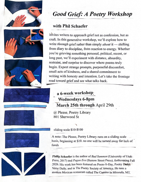 Wednesdays, 6-8 from March 25th through April 29th (6 weeks), Good Grief: A Poetry Workshop with Phil Schaefer, This workshop invites writers to approach grief not as confession, but as craft. In this generative workshop, we’ll explore how to write through grief rather than simply about it — shifting from diary to discipline, from reaction to energy.